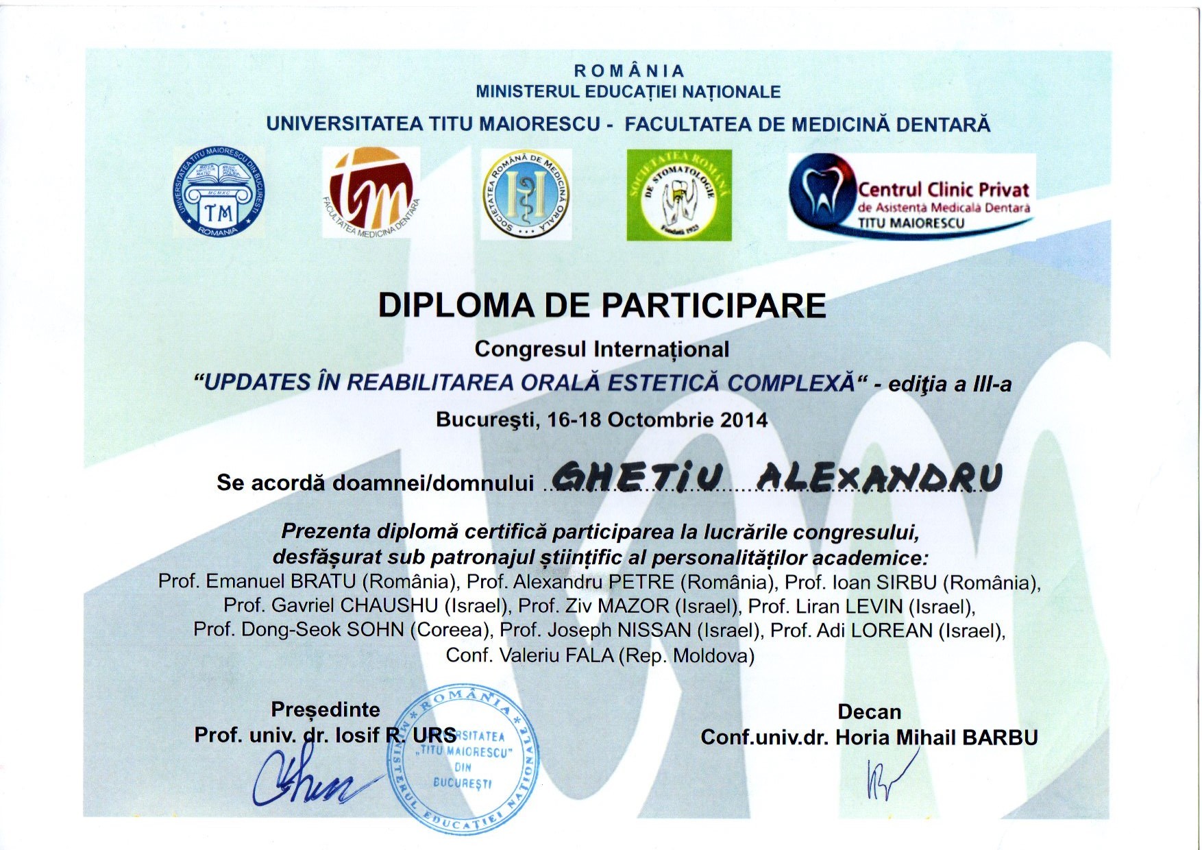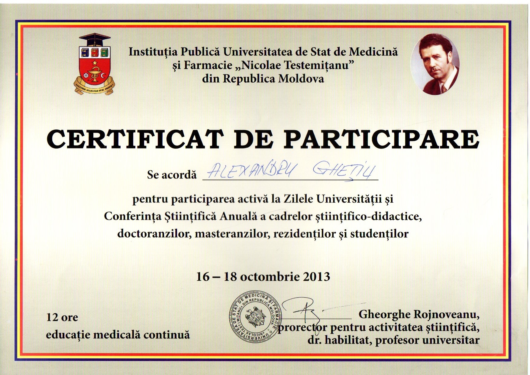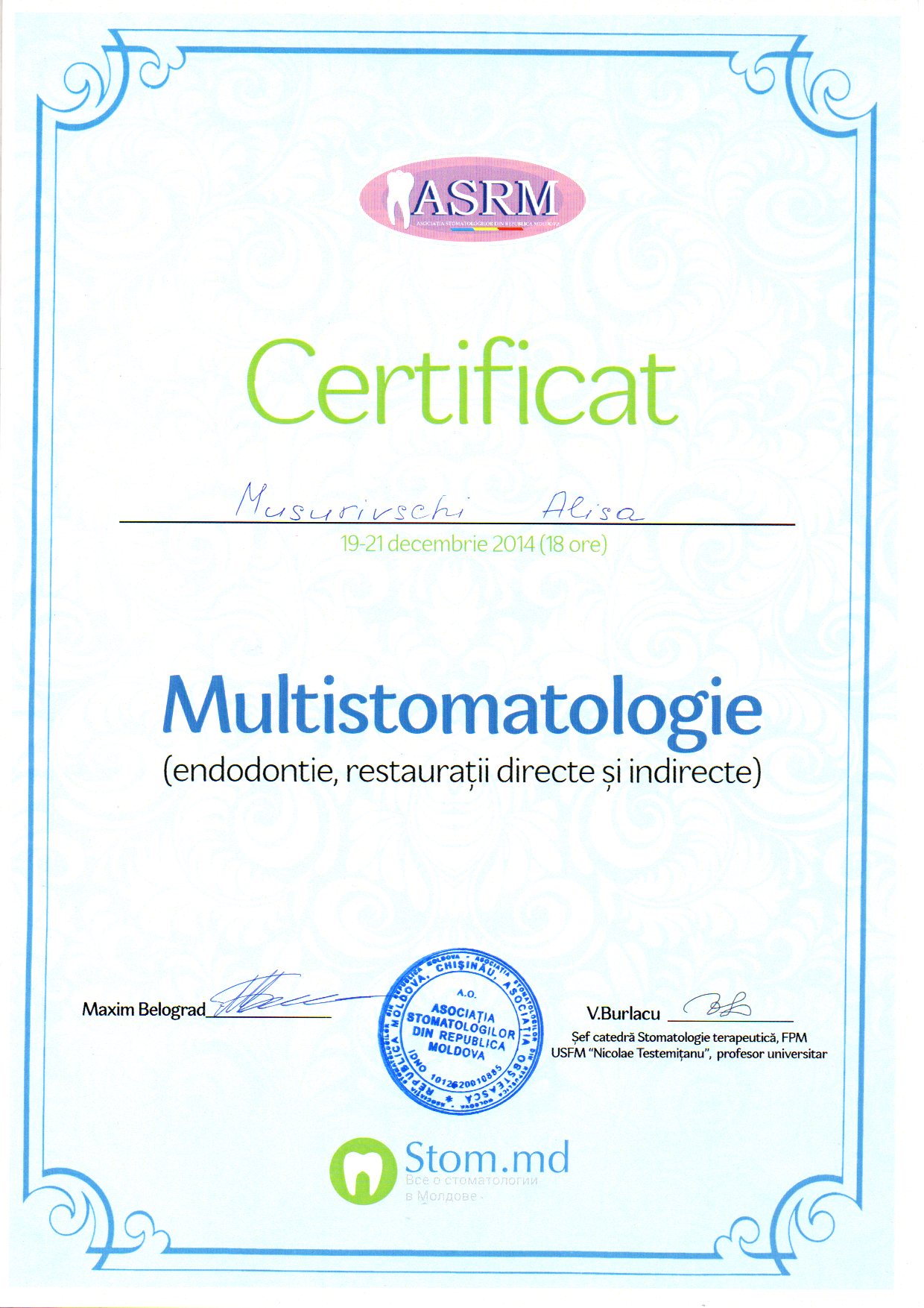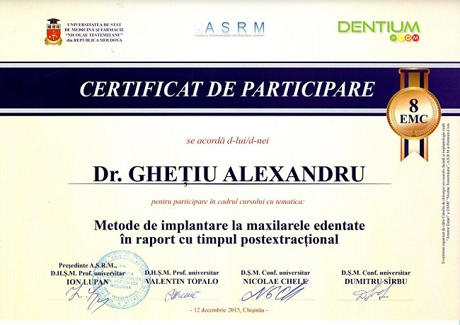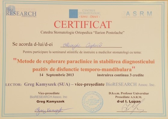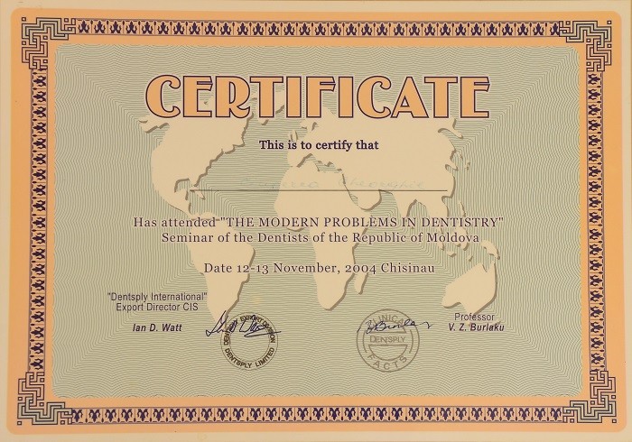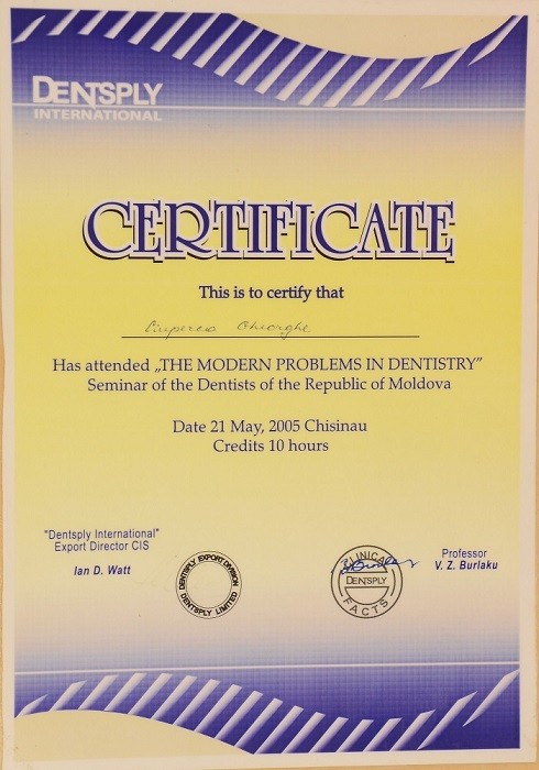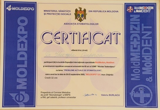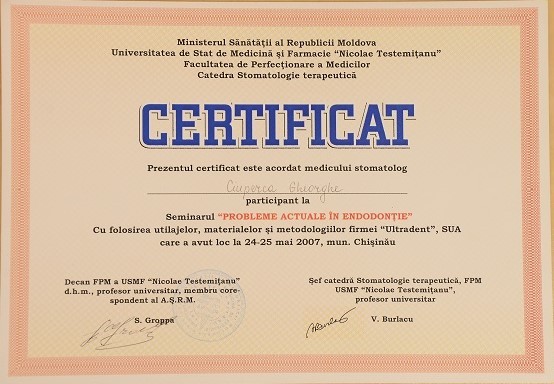 2001-2004 – Государственный Университет Медицины и Фармакологии им. Николая Тестемицану, Стоматологический факультет, резидент.