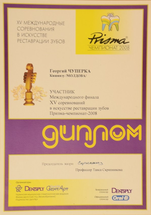 Многочисленные курсы и упорный труд привели к участию в престижном международном соревновании среди стоматологов в области реставрации фронтальных зубов «Призма-чемпионат» и завоеванию следующих наград:
