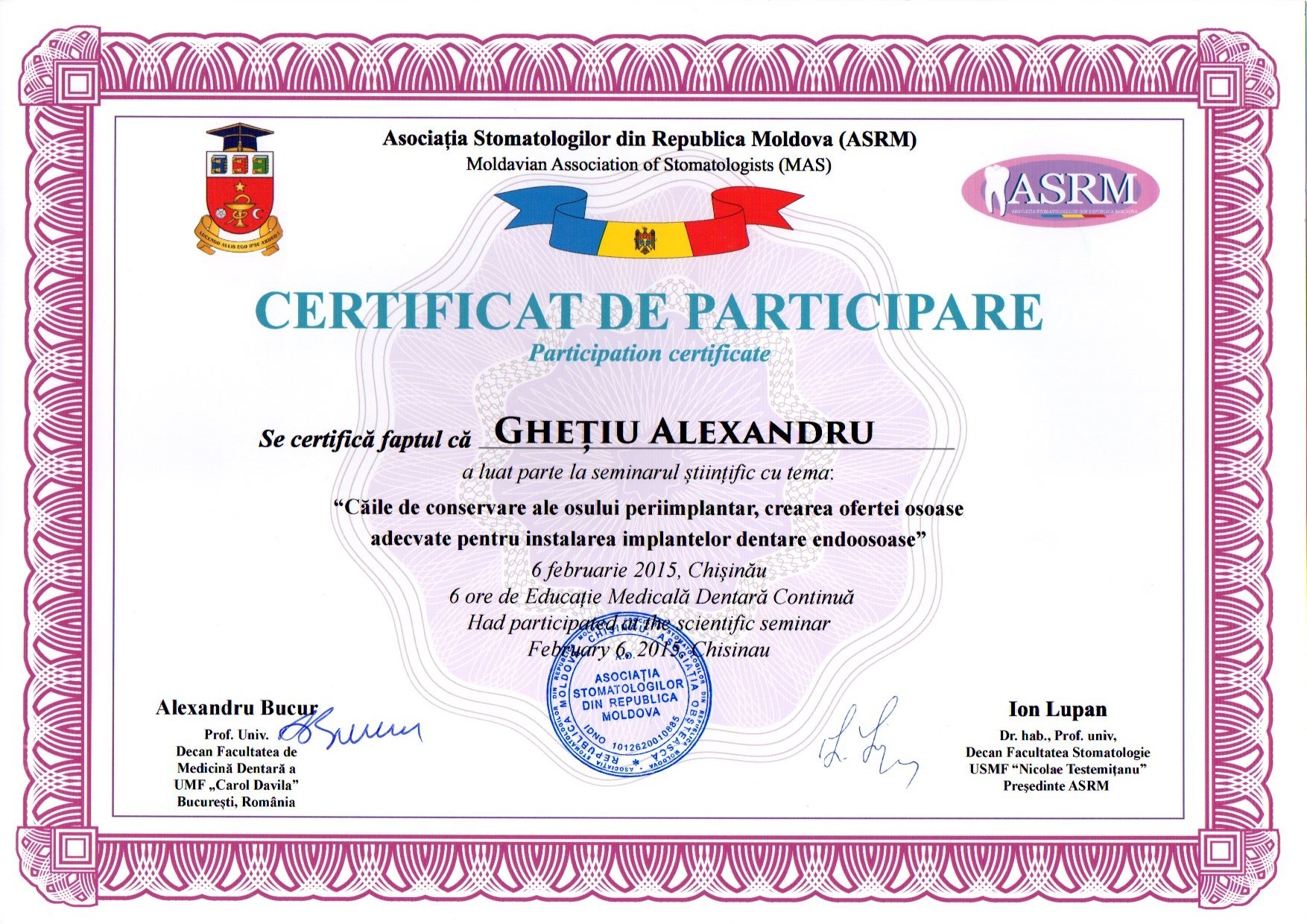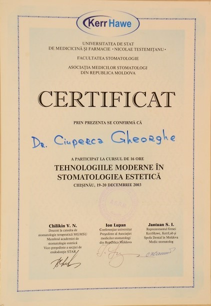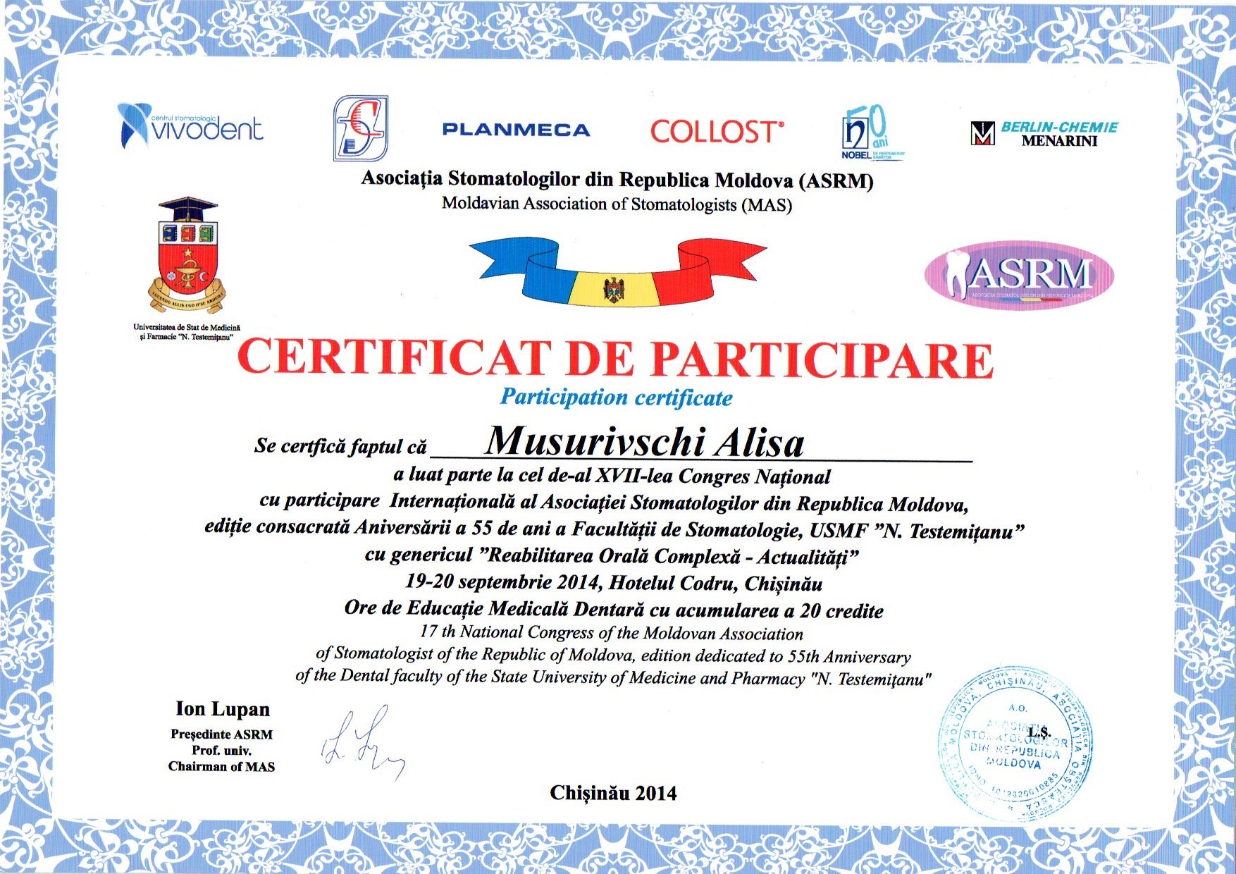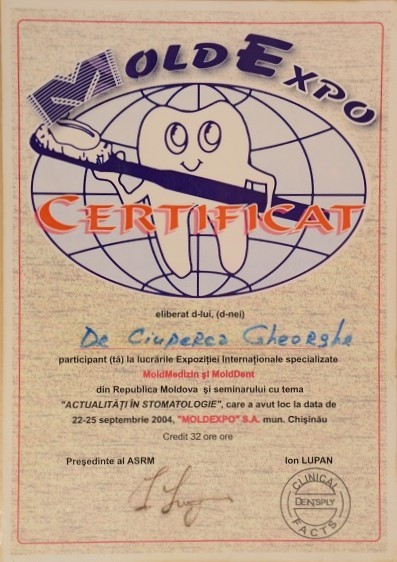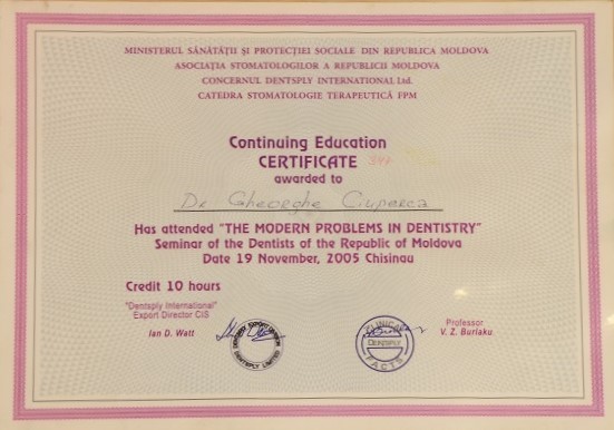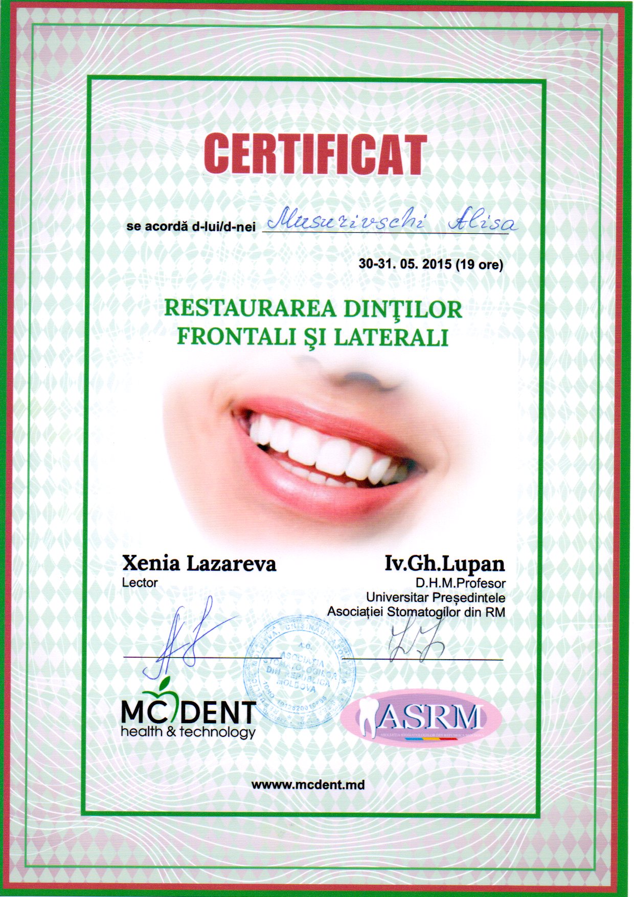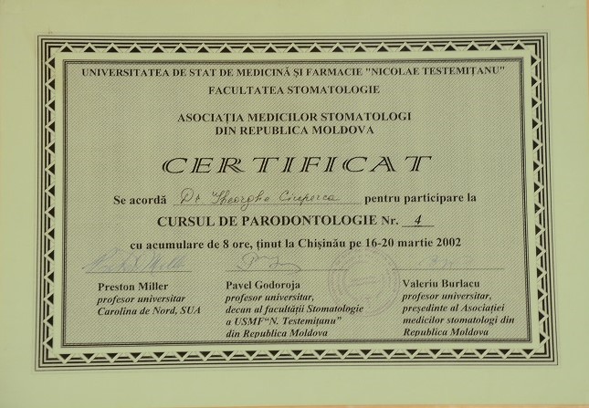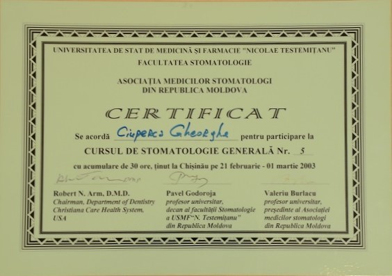 2001-2004 – Universitatea de Stat de Medicină și Farmacie „N. Testemițanu”, Facultatea Stomatologie, rezident.